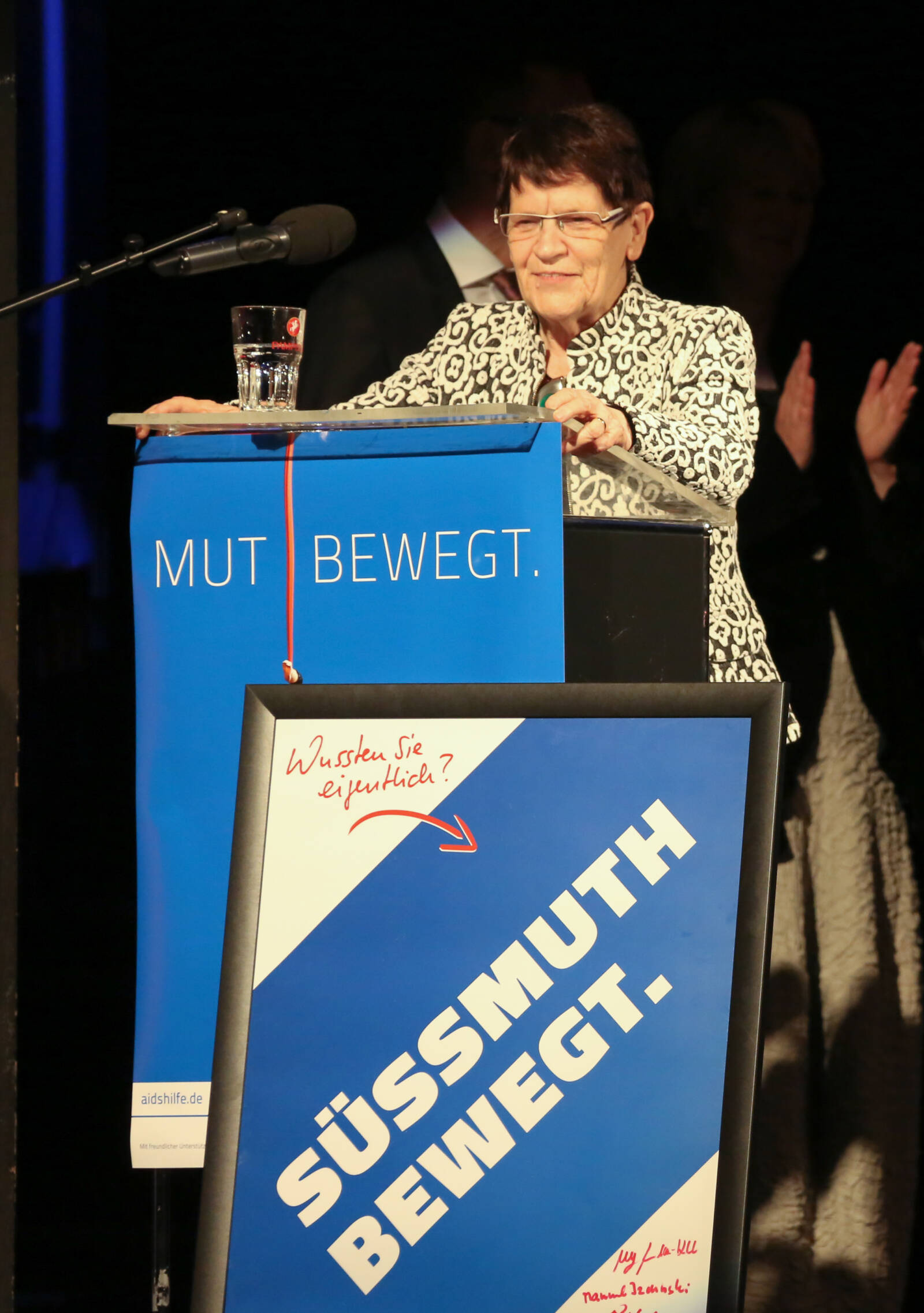 Der Abend, an dem die Deutsche Aidshilfe Rita Süssmuth die Ehrenmitgliedschaft verlieh, trug den Titel: „Mut bewegt.“ und sie bekam von uns ein Kampagnenplakat mit der Headline „Süssmuth bewegt.“ In ihrer Dankesrede lenkte sie die Aufmerksamkeit wieder auf die Themen, für die sie ihr Leben lang mutig gekämpft hat: